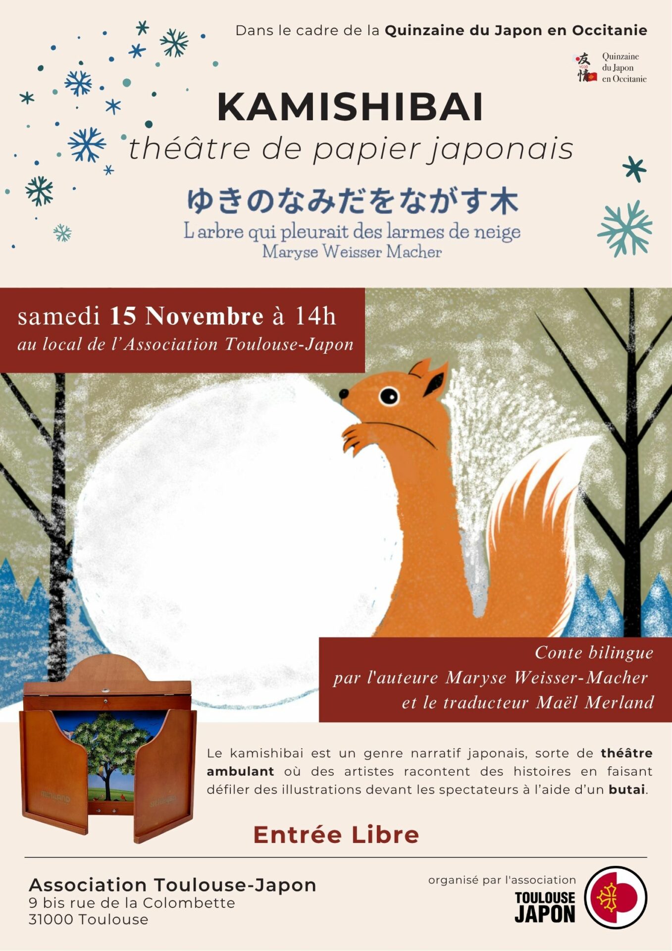 Dans le cadre de la Quinzaine du Japon en Occitanie, venez découvrir le kamishibai au travers du conte bilingue « L’arbre qui pleurait des larmes de neige », de l’auteure Maryse Weisser-Macher et du traducteur Maël Merland.