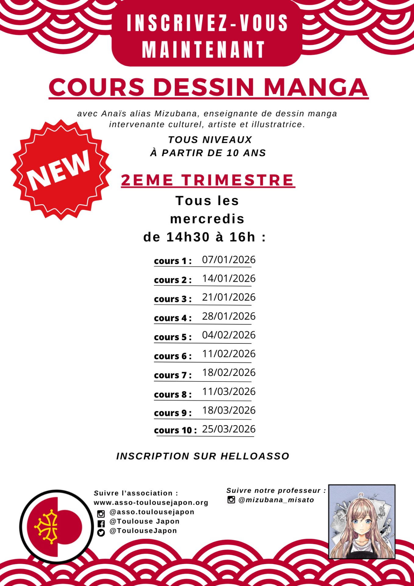 Les cours de manga sont animés par Anaïs. Ces cours s’adressent aux enfants de 10 ans minimum et sont construits de façon à fournir aux élèves une progression pédagogique tout au long de l’année. Néanmoins un élève peut s’inscrire en cours de route, il sera suivi particulièrement pour rattraper son retard. L’inscription, donc l’engagement de participation, se fait par trimestre.
